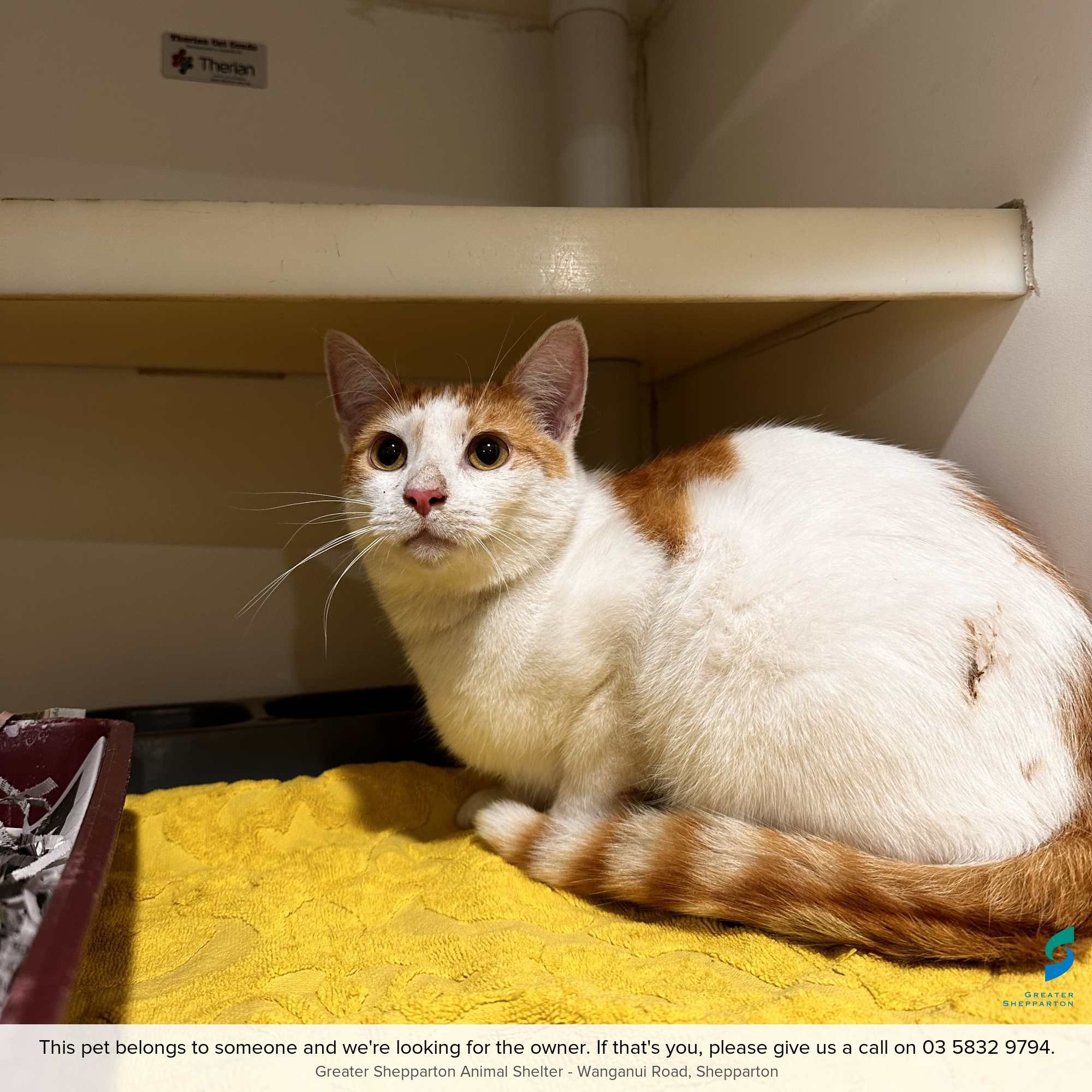 Please contact the Shepparton Animal Shelter on 03 5832 9794 to find out more or to claim this animal. You can also visit the Animal Shelter at 125 Wanganui Road, Shepparton, by appointment.