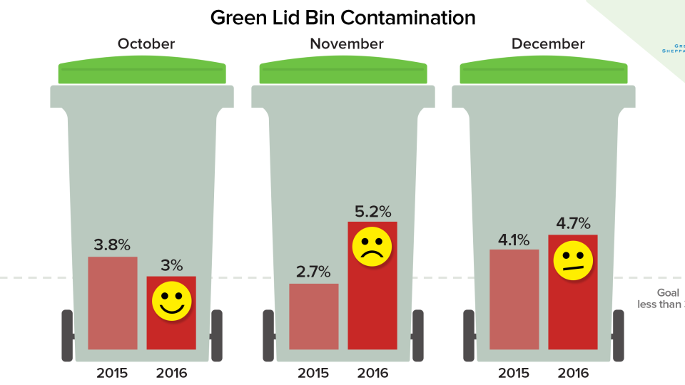 Contamination of the organic green lid bins dropped for the month of December 2016 to 4.68 per cent from 5.24 per cent in November but there are still improvements to be made. Read more