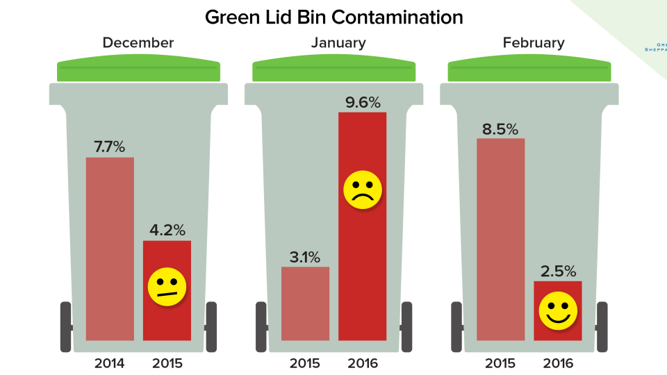 Contamination of the green lid bins for the month of February 2016 was down to 2.54 per cent compared to 8.5 per cent in February last year. Read more