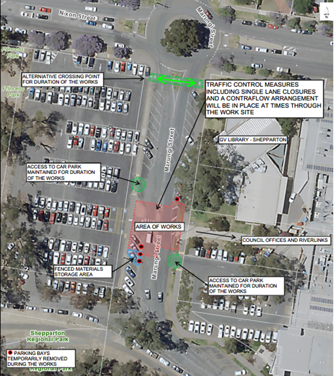 Access to the Shepparton Library, Council offices, Riverlinks and nearby car parks will be maintained, with pedestrians directed to an alternative crossing at the Marungi Street and Nixon Street roundabout.